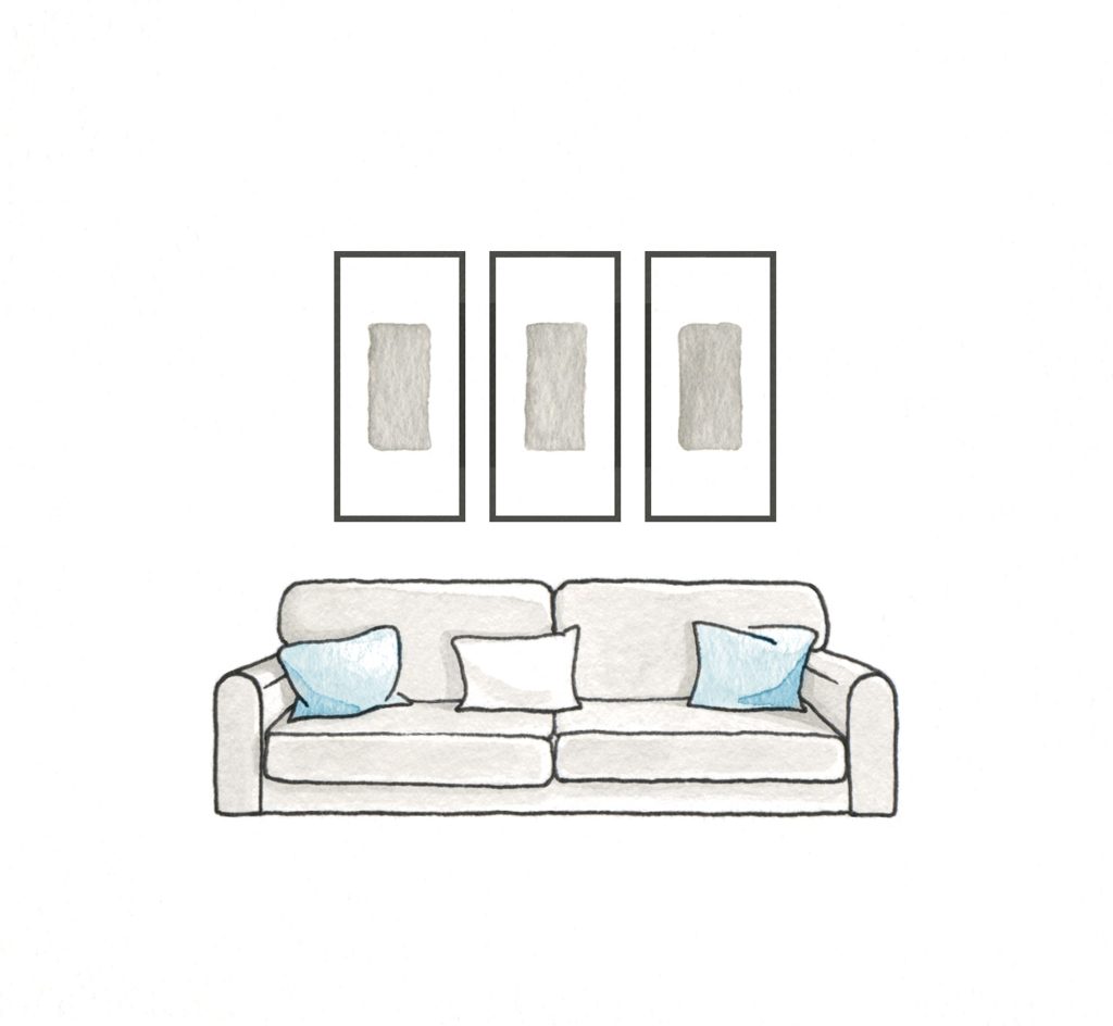 Como norma establecida, se estima que el ancho del cuadro no debe sobrepasar el 80% del largo del mueble; Por servirnos de un ejemplo, si tu sofá tiene un ancho de 280 cm, lo idóneo es escoger una composición o conjunto que no pase los 220 cm, si bien no es recomendable que ocupe una área pequeñísima con relación al tamaño de el sofá.